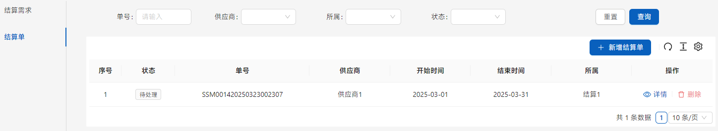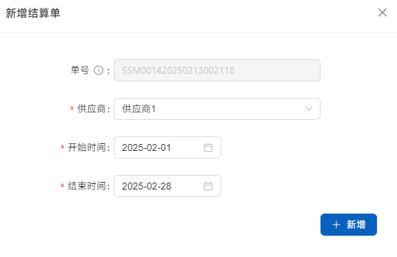 在[财务管理]-[供应商结算单]-[结算单]中新建结算单,填写结算的时间范围。