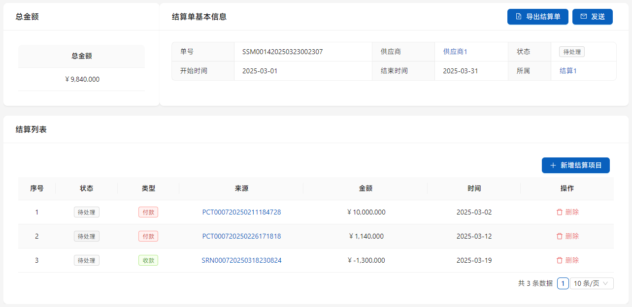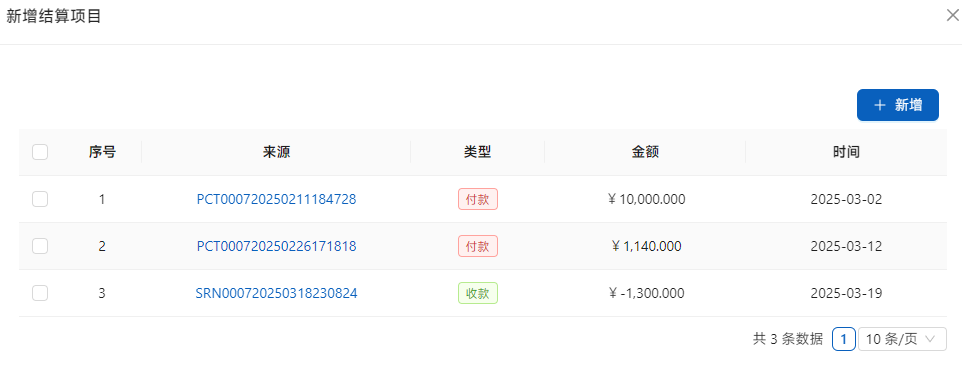 点击结算列表右上方的[新增结算项目],弹窗内显示符合该供应商,并且符合结算时间的项目。选择后点击[新增]。