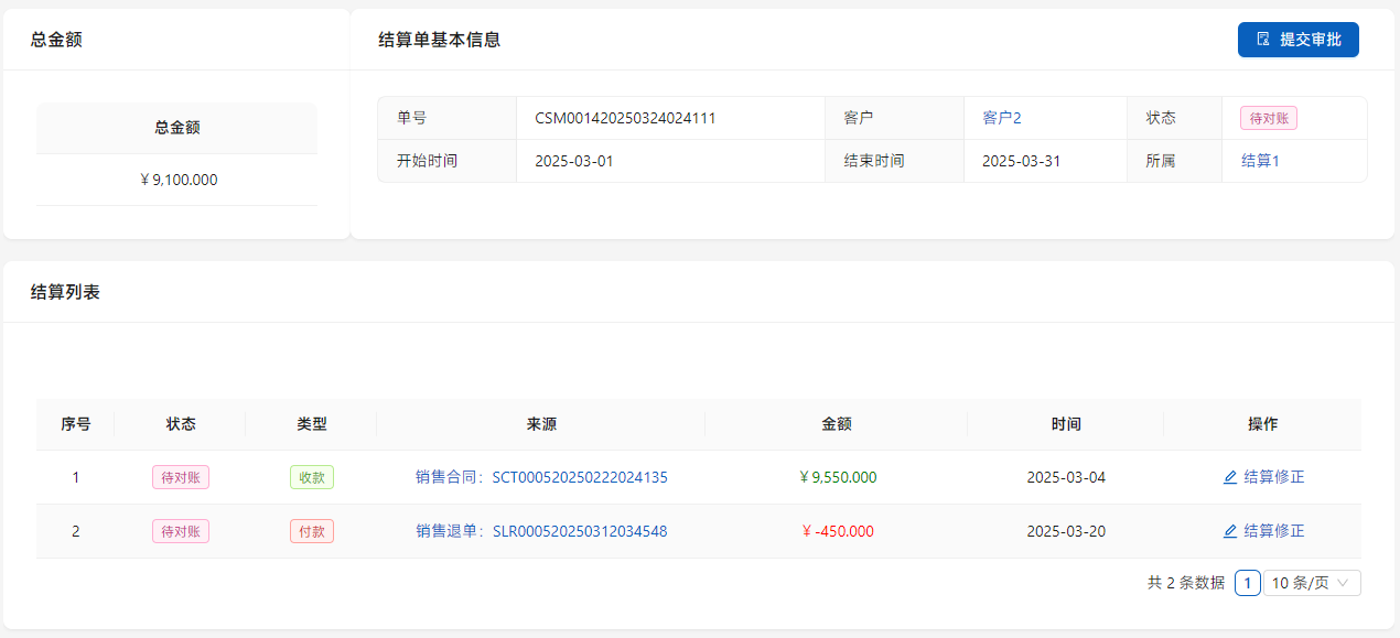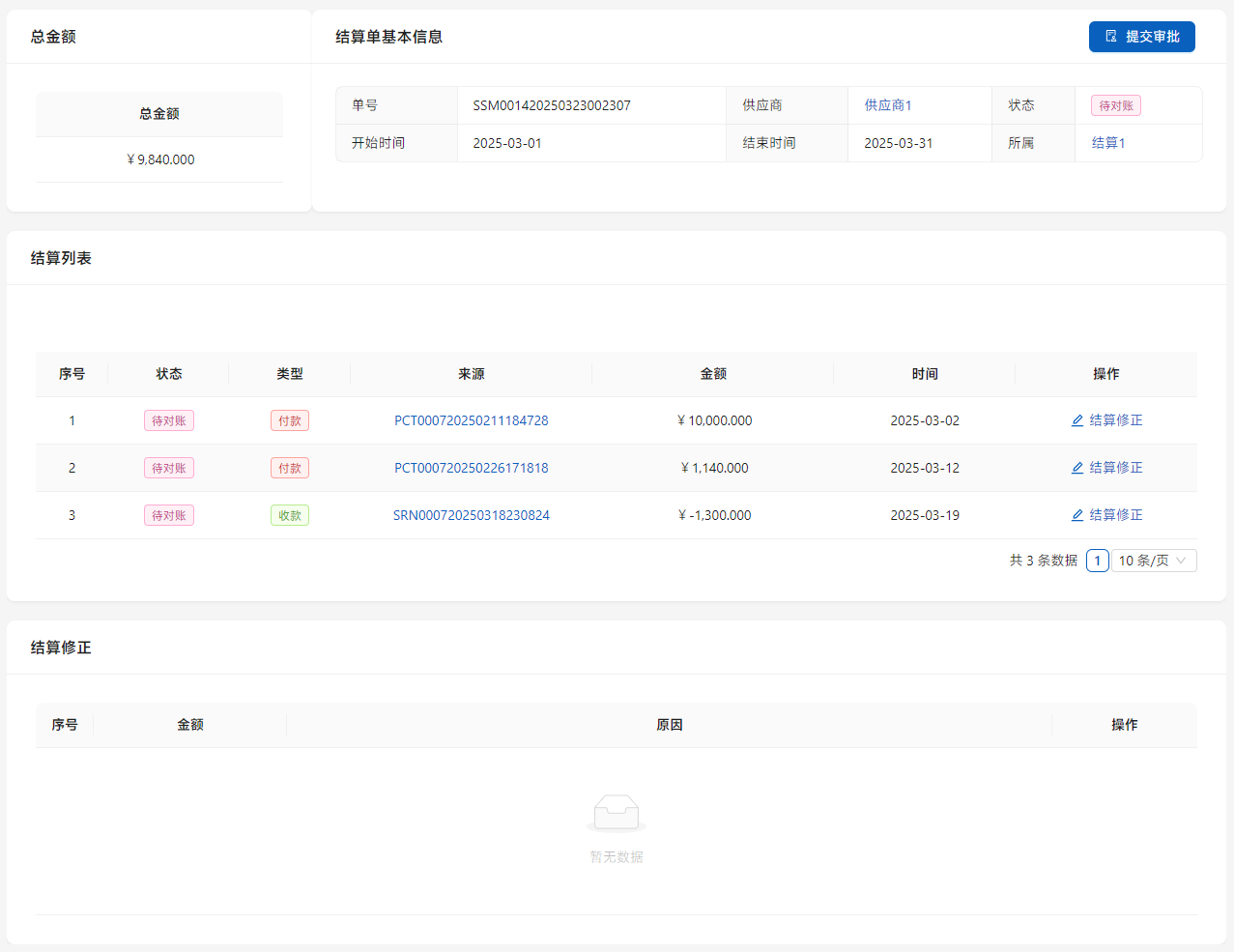 待供应商复核完毕,如有修正,点击[新增结算修正],添加修正内容,点击[提交审批]。