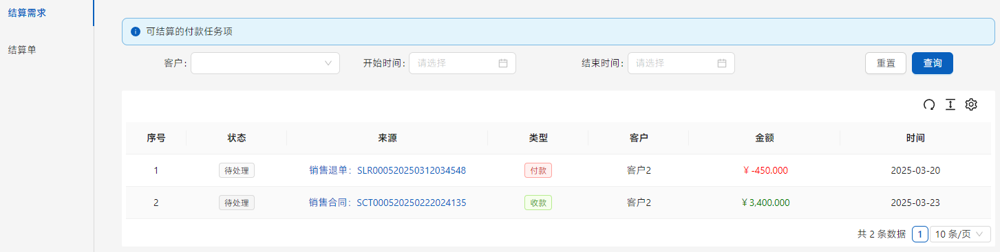 在[财务管理]-[客户结算单]-[结算需求]中有待结算的项目。