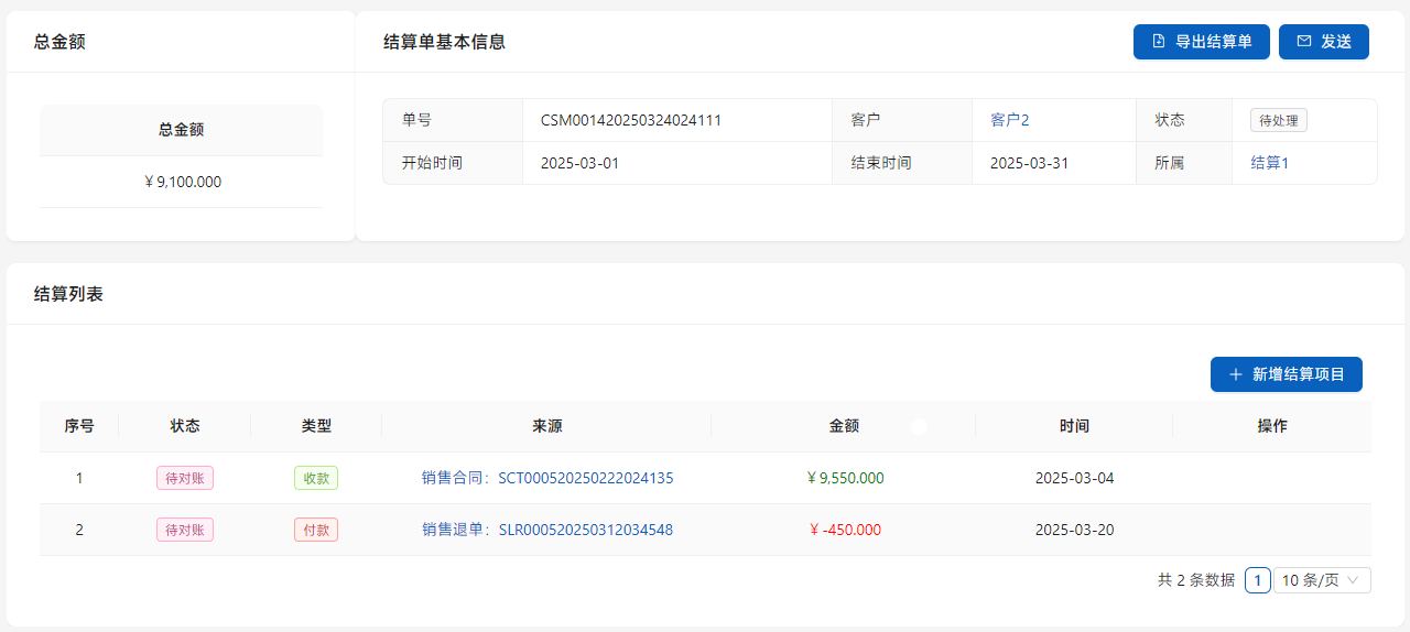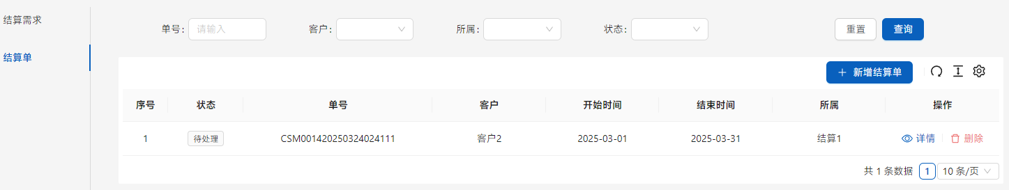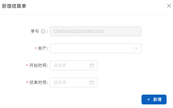 在[财务管理]-[客户结算单]-[结算单]中新建结算单,填写结算的时间范围。