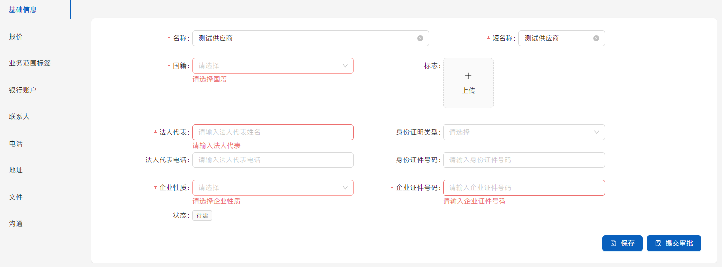 [银行账户]、[联系人]、[电话]、[地址],必须都有,默认选项会直接在各类单证中调取,如果不填可能导致出错。然后提交审批。