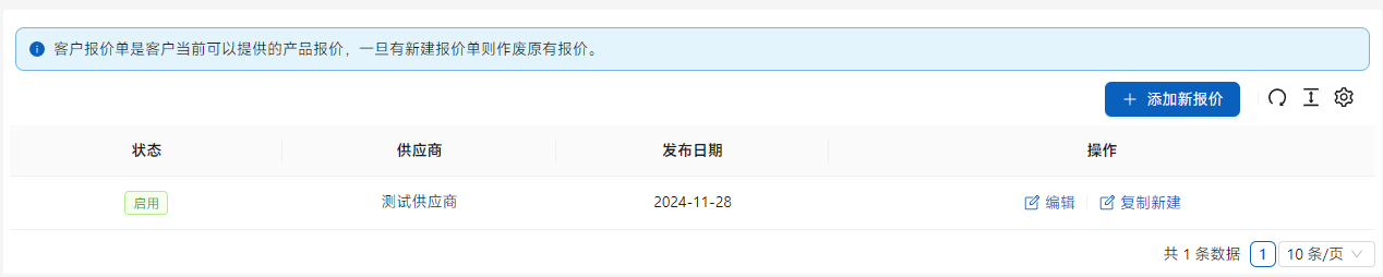 新报价建立之后,老的报价将无法再使用,所以在建立时,需要完整的建立报价体系,切记不是新增。为了避免重复作业,可以选择复制上一份报价单进行修改操作。