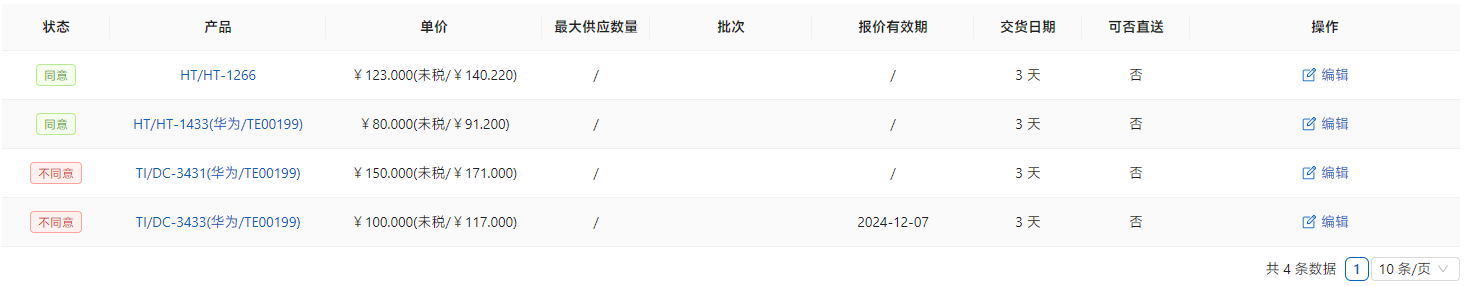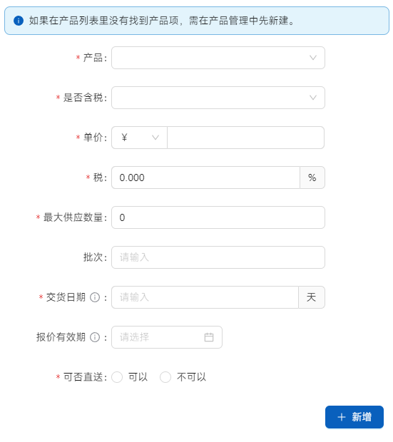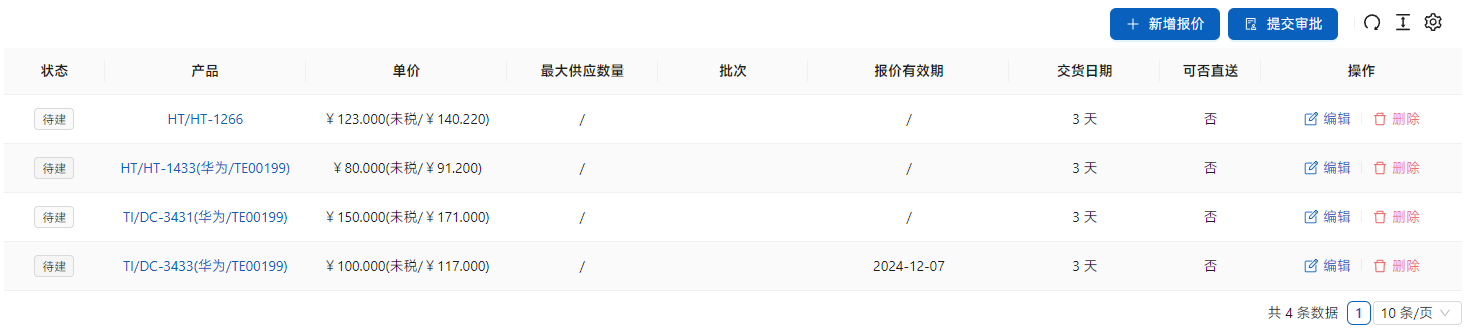 新建后点击右侧[编辑]进行报价编辑。如果是供应商提供的报价表,选择[新增报价],如果供应商未提供,可以通过询价单进行询价,询价结果会添加到报价信息里。如果供应商可以直接发送给客户的话,请选[可以直送],这就可以在后续销售中选到。