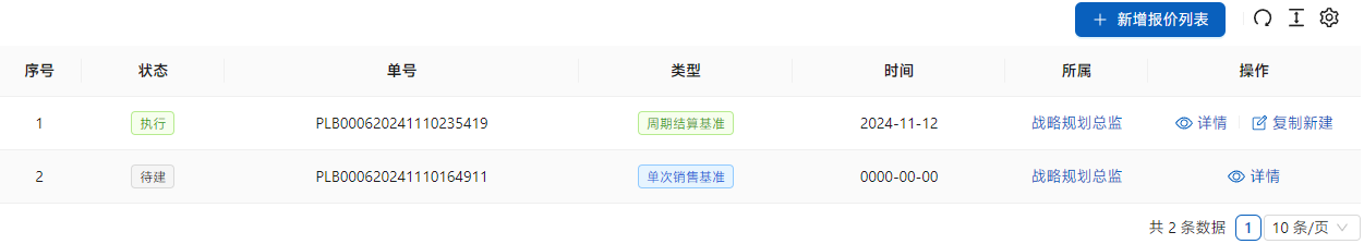 客户报价需要先由战略规划部门制定基准售价,再此基础上进行针对性报价,如果低于基准售价需要通过审核。在[战略规划]-[报价制定]中进行新建基准报价。为了避免重复劳动,可以通过列表后面的[复制新建]来复制老的基准单进行修改。