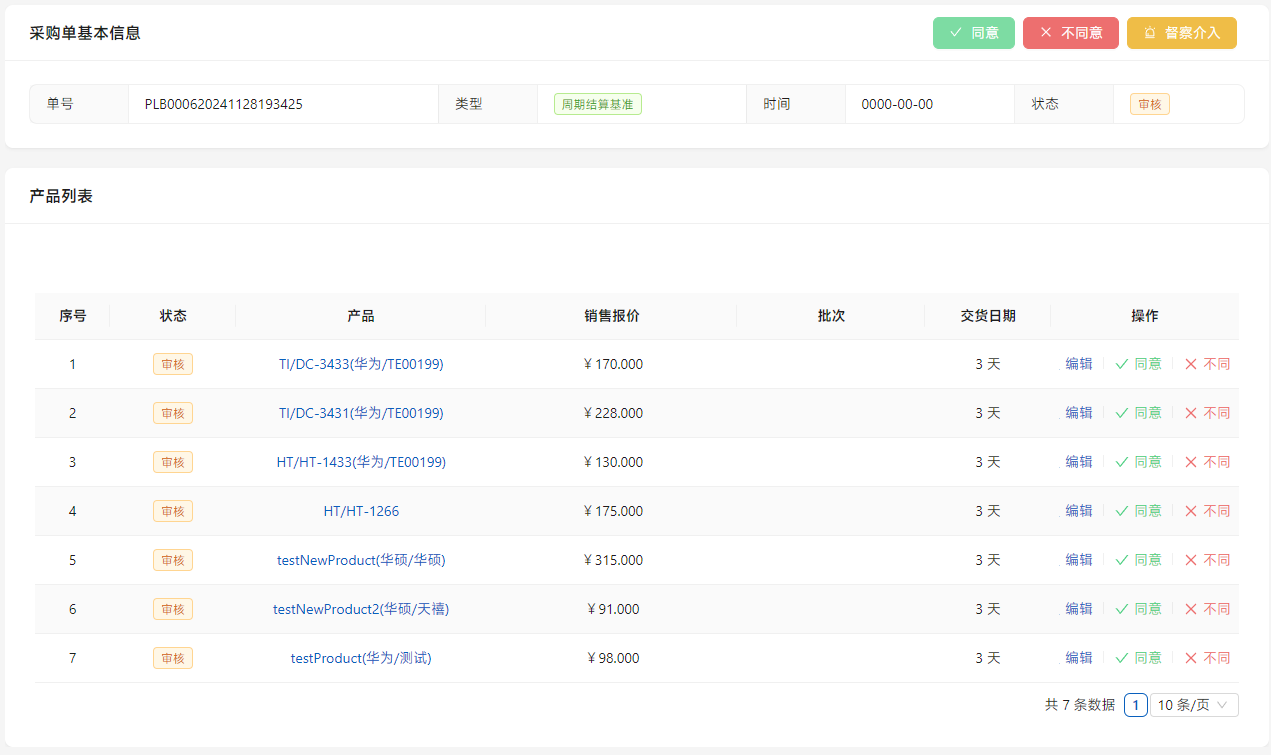 审核每一项报价,如果通过则点击[同意],如果不同意则点击列表右方的[不同意],如果报价不符合要求点击右上方的[不同意]返回进行修改,修改意见可以在备注中填写。如果不需要修改则点击右上方的[同意]完成此报价设定。如果未选择单项的同意或者不同意,在确认后都认定为不同意。